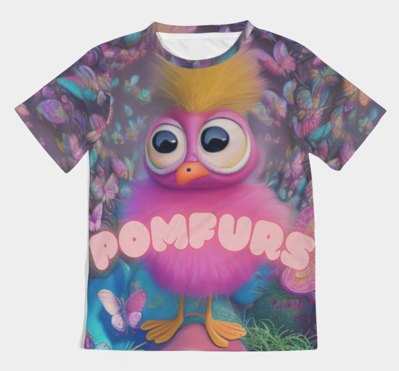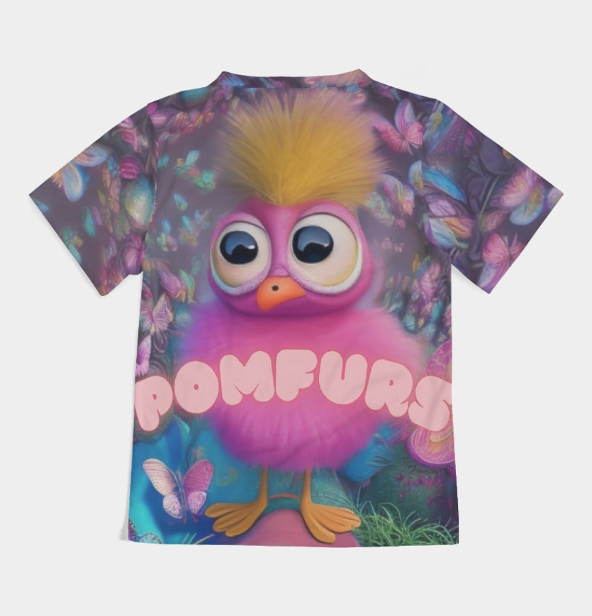 An adorable T-Shirt with one of most adorable creatures, a POMFUR! Polyester fabric, for kids, All-Over Printing. 8.11 Oz. Polyester fabric. Dye-sublimation printing. Care: Cold water (max 40℃ or 104℉); Non-chlorine bleach; Iron with cover; Do not tumble dry.